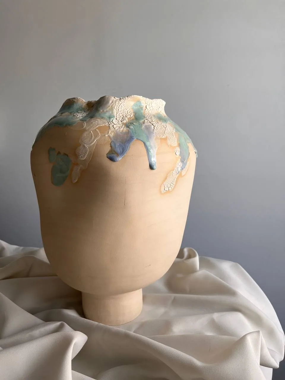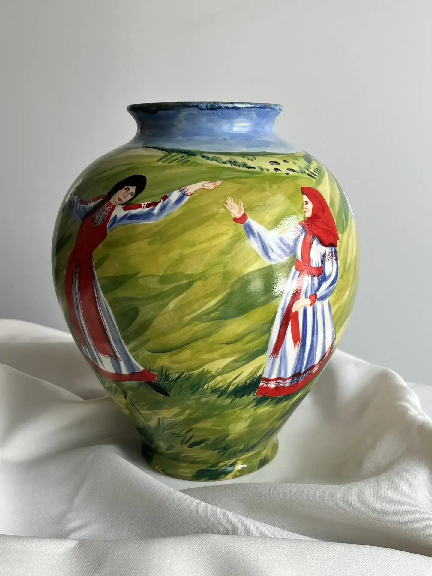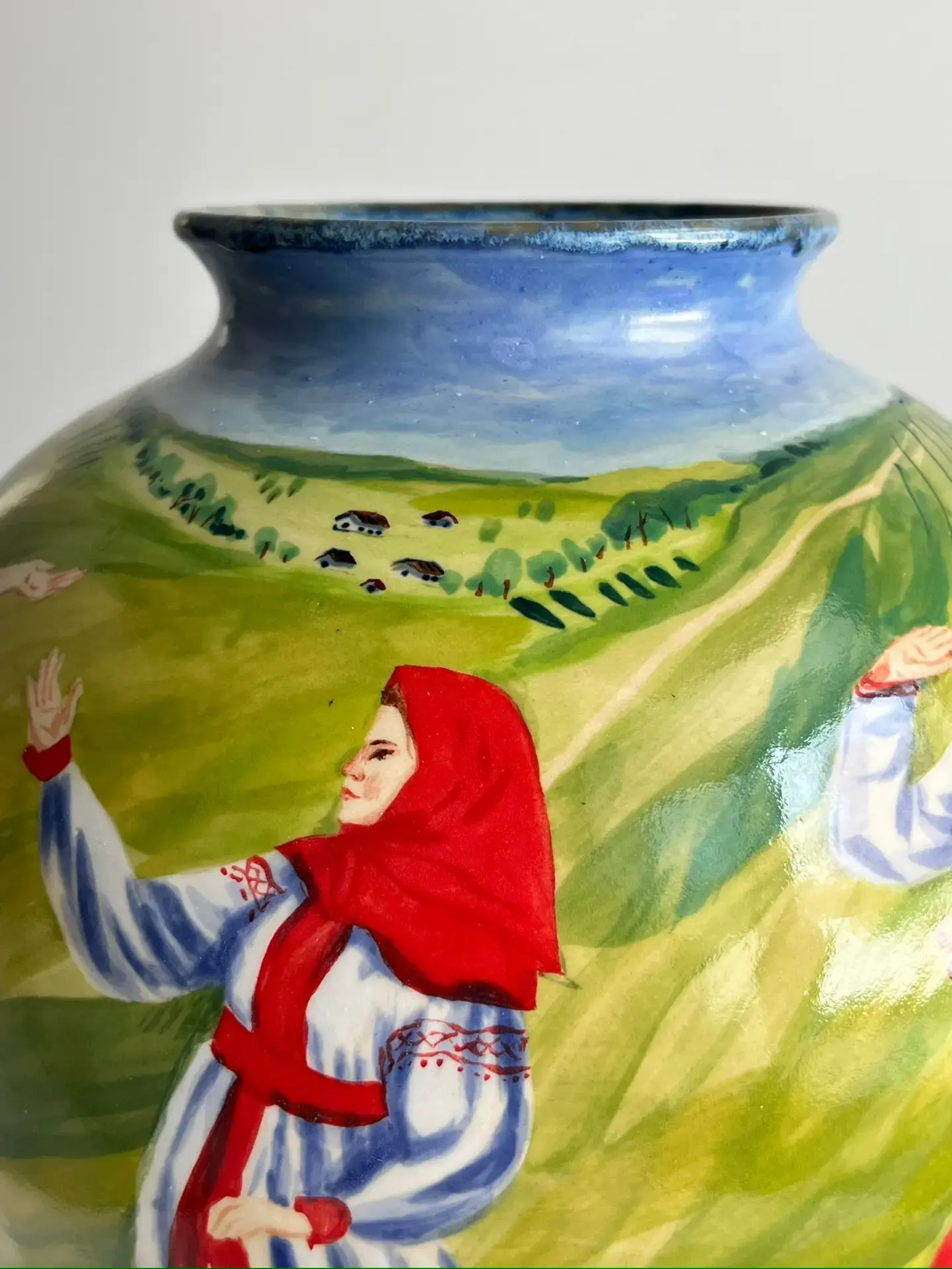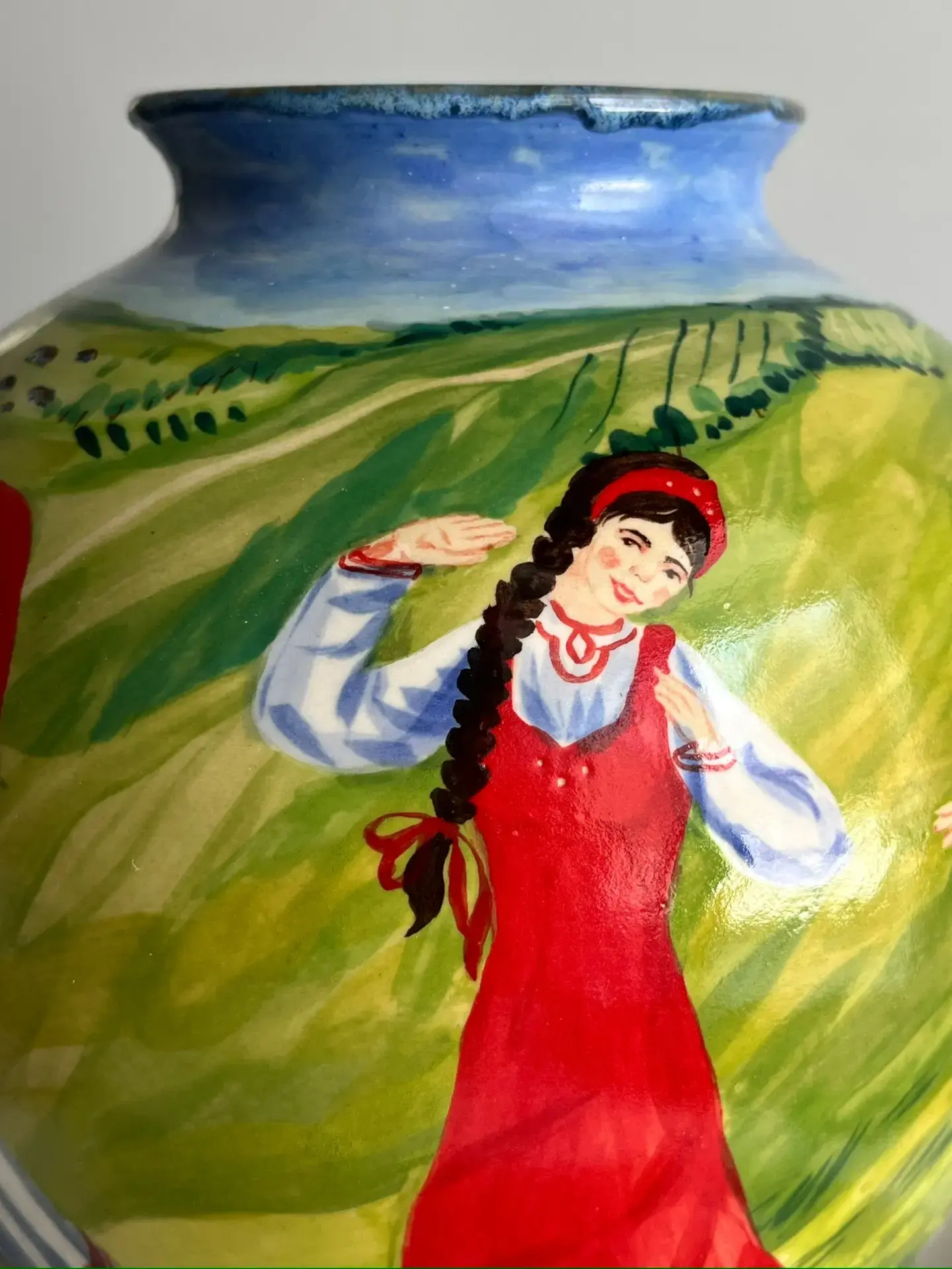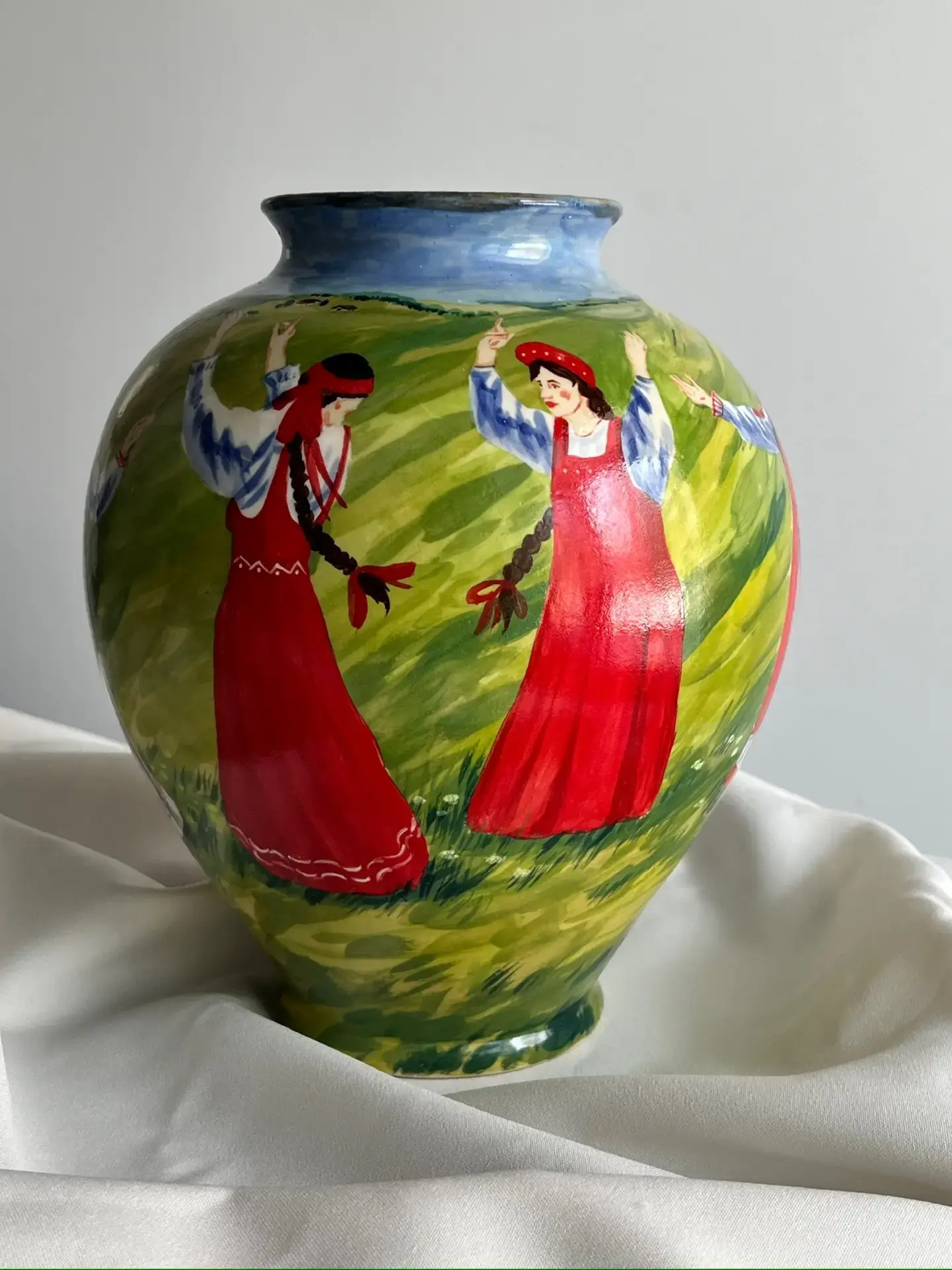 Перед нами разворачивается яркая и динамичная сцена традиционного русского хоровода. По всей окружности вазы изображены девушки в национальных костюмах, украшенные вышивкой и орнаментами.